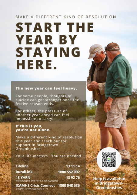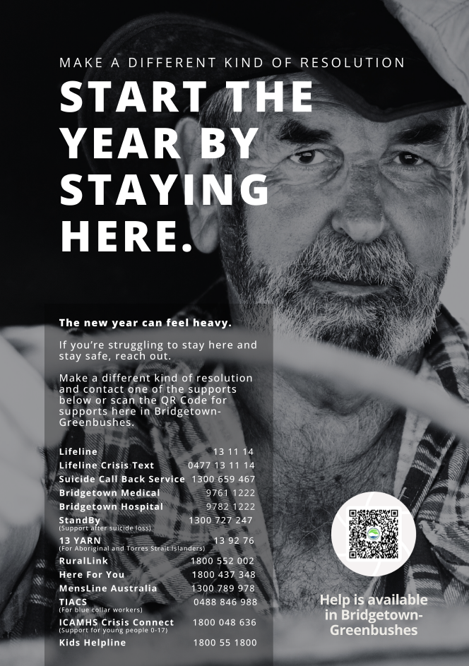 Help raise awareness of mental health, suicide, and help services in Bridgetown-Greenbushes by downloading these FREE resources and displaying them in your office, business, or community space.